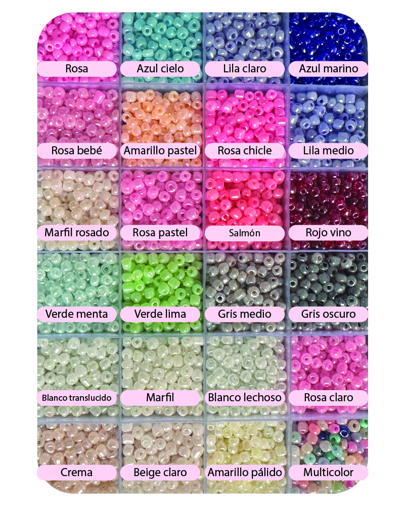 Sorpresa, Mezcla multicolor pastel, Rosa, Azul cielo, Lila claro, Azul marino, Rosa bebé, Amarillo pastel, Rosa chicle, Lila medio, Marfil rosado, Rosa pastel, Salmón, Rojo vino, Verde menta, Verde lima, Gris medio, Gris oscuro, Blanco translúcido, Marfil, Blanco lechoso, Rosa claro, Crema, Beige claro, Amarillo pálido