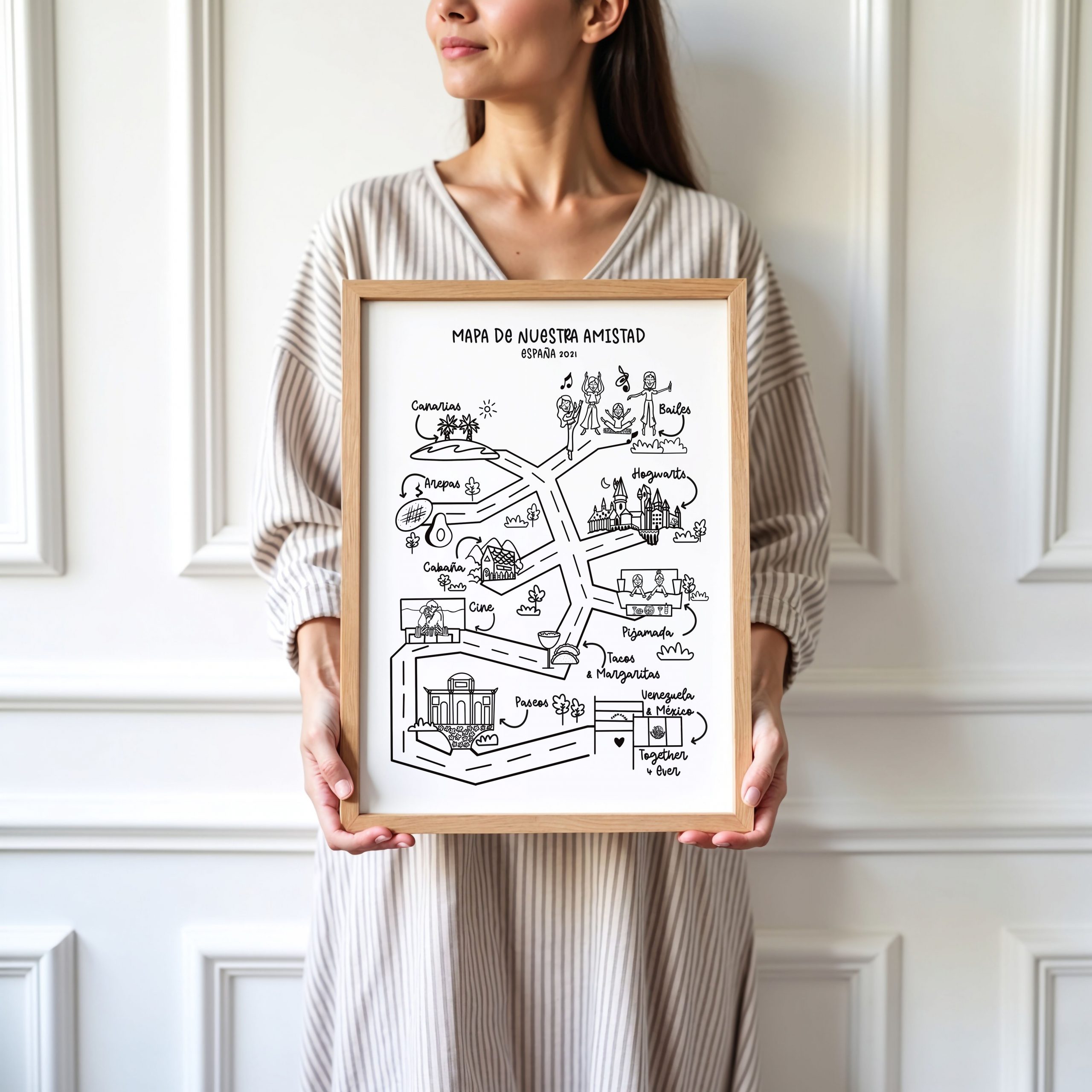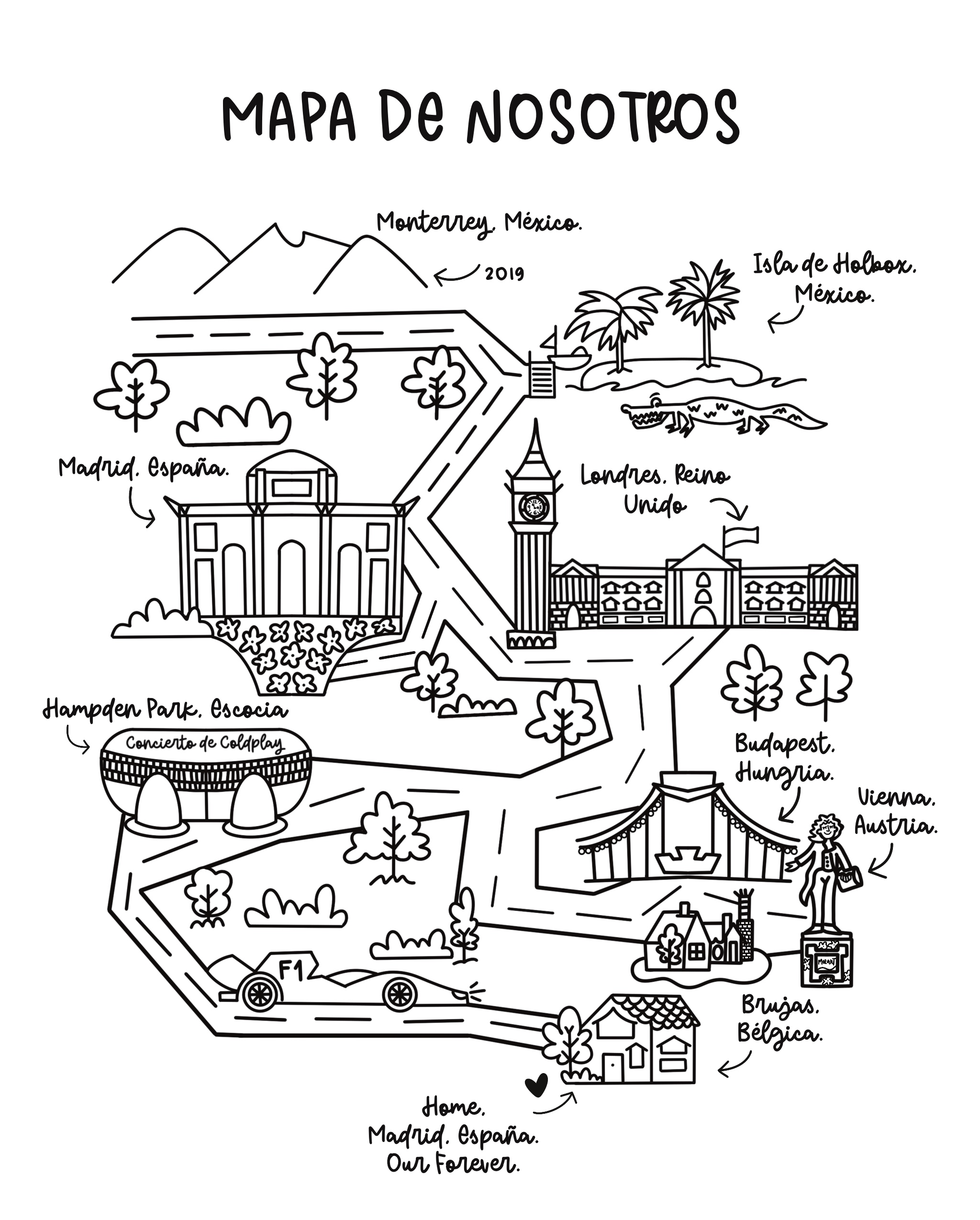 Un Mapa de Nosotros es una ilustración personalizada que representa los lugares más importantes en la historia de una pareja, familia o amistad. Es una forma creativa y única de plasmar momentos especiales a través de un diseño minimalista y significativo.